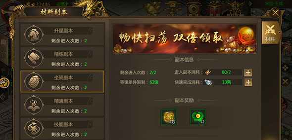 每天玩家有两次挑战坐骑副本的机会,每次进入需要消耗副本卷轴2个以及10两绑银。副本奖励4W经验以及12个坐骑果实。当然了,玩家也可以自主选择一键双倍功能,需要消耗11两金子和90两绑银以及18个副本卷轴,就可以获得材料副本中所有材料的双倍奖励。但还是希望玩家们酌情考虑!
