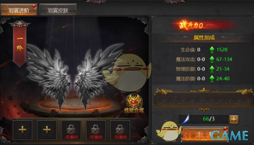 羽翼皮肤,可收集皮肤碎片,激活对应的羽翼皮肤,激活成功后获得相应的属性加成。如获得相同碎片,可升级同部位碎片属性。