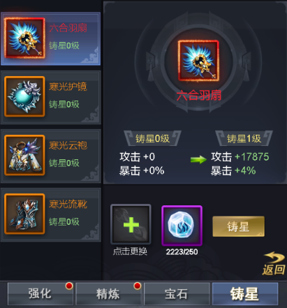 个人觉得这是性价比最高的,铸星需消耗铸星石和同级别装备,但它不仅可以获得并提升闪避,暴击,命中率等属性加成,同时更可提高攻击,物防,生命等基础属性。