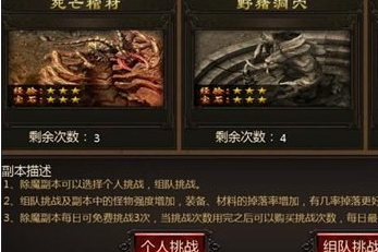 除魔副本分个人和组队两种挑战方式,组队副本比个人副本难度更高,当然奖励也更加丰富。