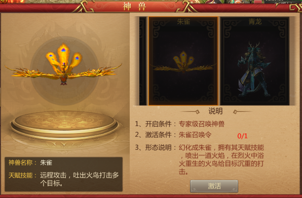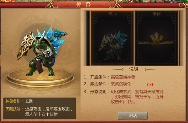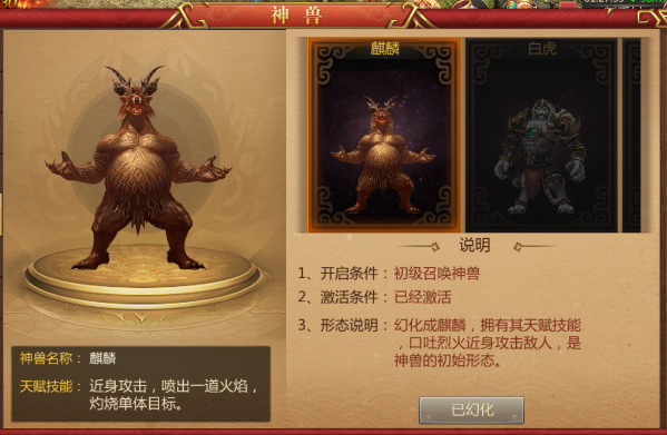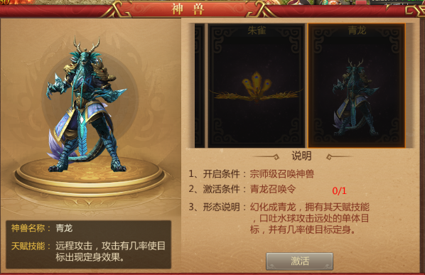 麒麟的形态为默认开启,直接就可以召唤使用,而其他四种神兽形态则另外需要道具进行激活,白虎需要白虎召唤令,玄武需要玄武召唤令,朱雀需要朱雀召唤令,青龙需要青龙召唤令。当神兽激活后,才可以进行幻化。开启和激活所有的神兽形态后,道士可以随意在在几种神兽形态中来回幻化切换,用不同的神兽进行不同的战斗,让道士的战斗随性起来。