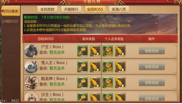 活动奖励:每一个BOSS首杀可额外获得首杀奖励,非首杀的BOSS只能领取个人奖励。