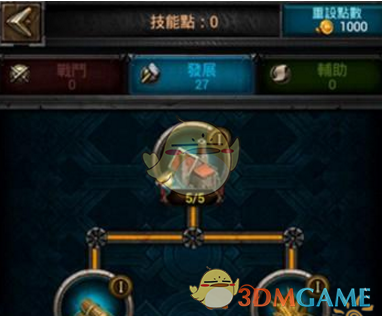 「发展」型天赋除了『丰收』及『资源保护』二项主动技能,其余的效果都是被动增加资源的生产及采集效率,为无法经常在在线的玩家提供稳定发展,『打发时间』的玩家全部无脑点满就好。