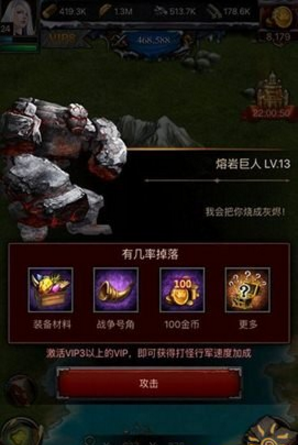 攻击怪物需要消耗体力,研究加快恢复体力的科技以及加快打怪行军速度的科技可以有效的提高打怪效率,VIP3级以上也拥有额外的打怪加成。和怪物进行战斗,可能会有小部分士兵受伤,受伤的部队会自动进入医院,如果医院空间不足,士兵会自动死亡。