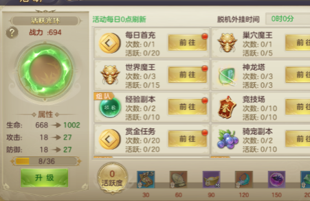 当你无任务可做的时候,可以选择去日常,那里有很多副本,比如神龙塔、骑宠副本,打完后可获得强化材料,可以提升大量的战力。
