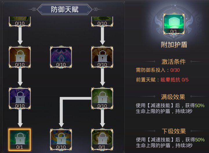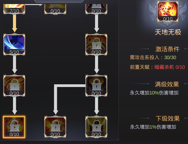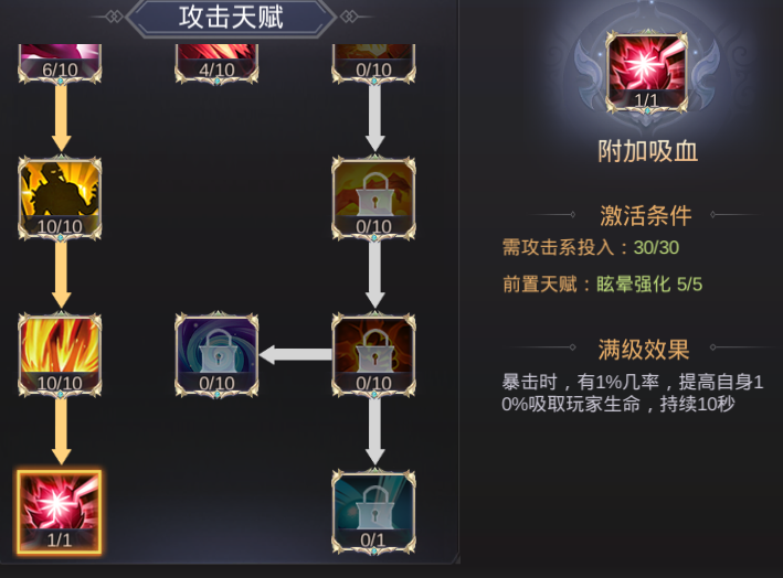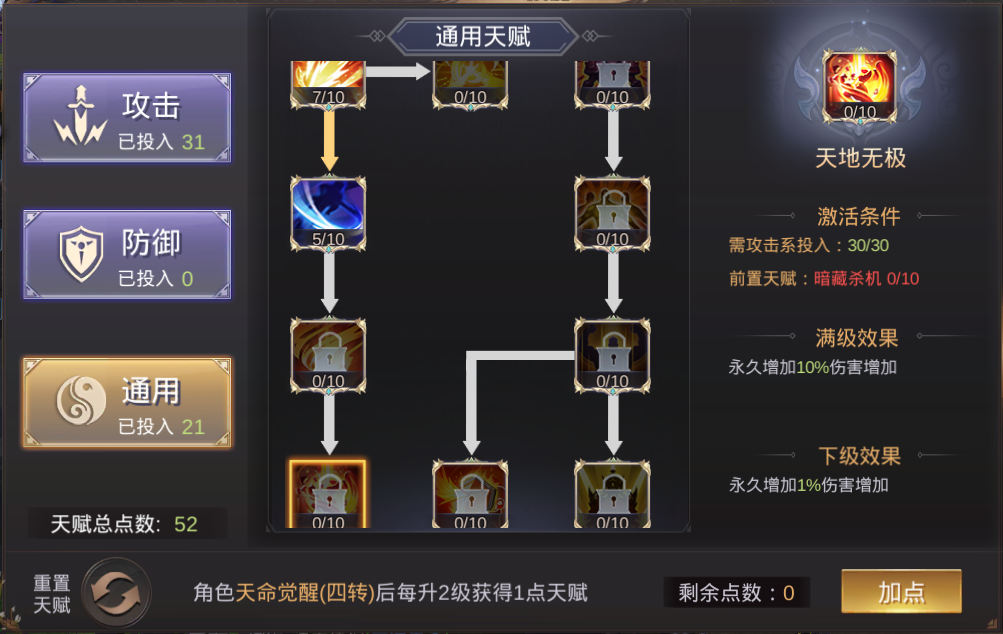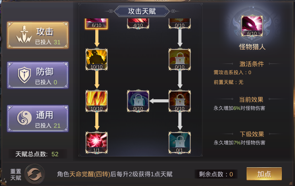 3、我们加点优先加到选定序列顶点、而其中攻击与防御方向的四条序列升级完每条需要天赋点31点、通用方向的两条序列则各需要45点。而因为升级较慢因此除了点完所选第一条序列之后时间跨度较大因此我们需要非常谨慎的选择之后天赋加点。