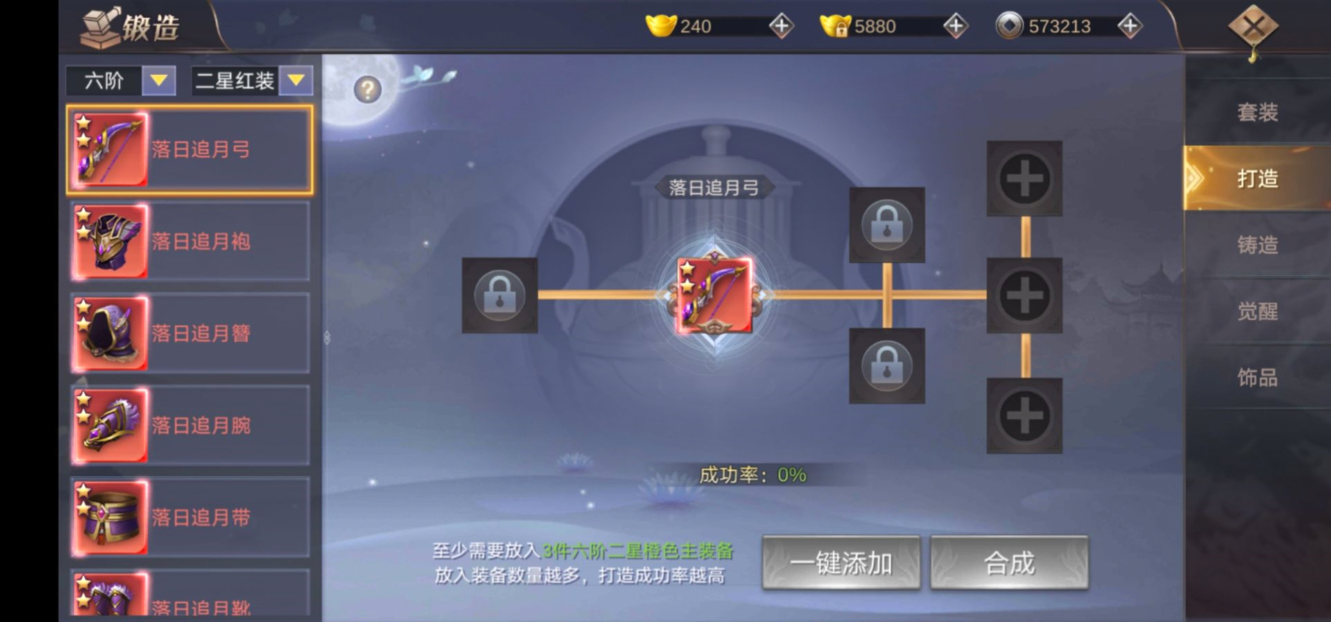 三件六阶橙色二星可以打造六阶红色二星;