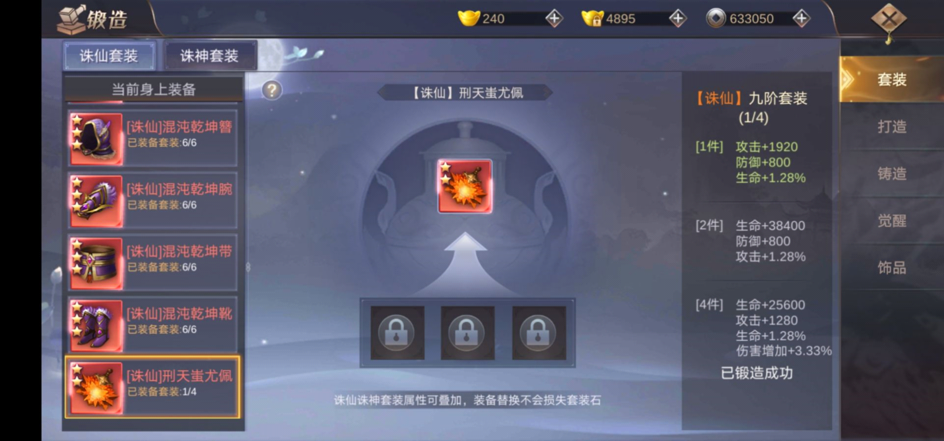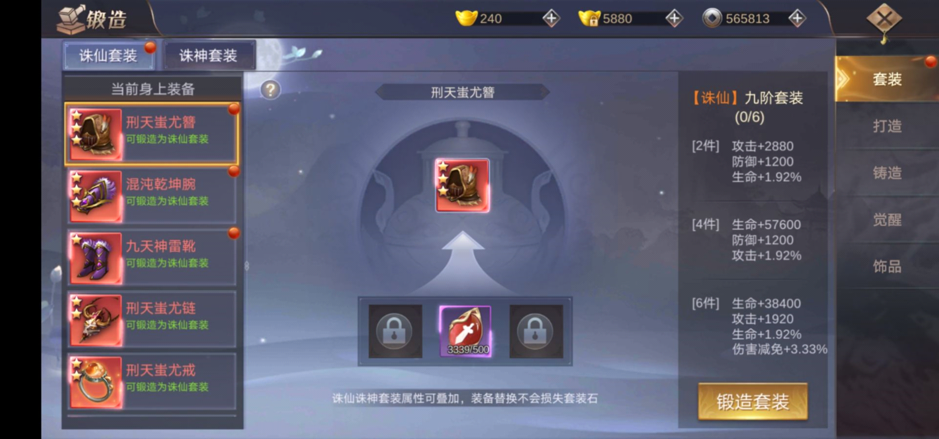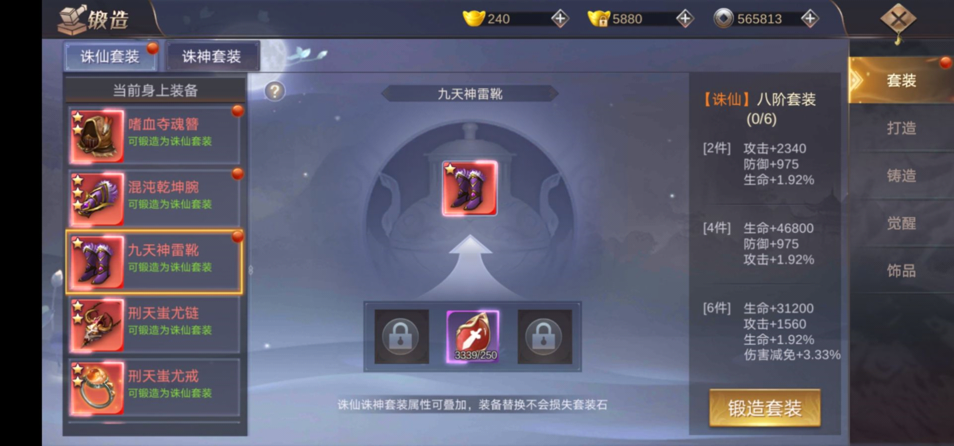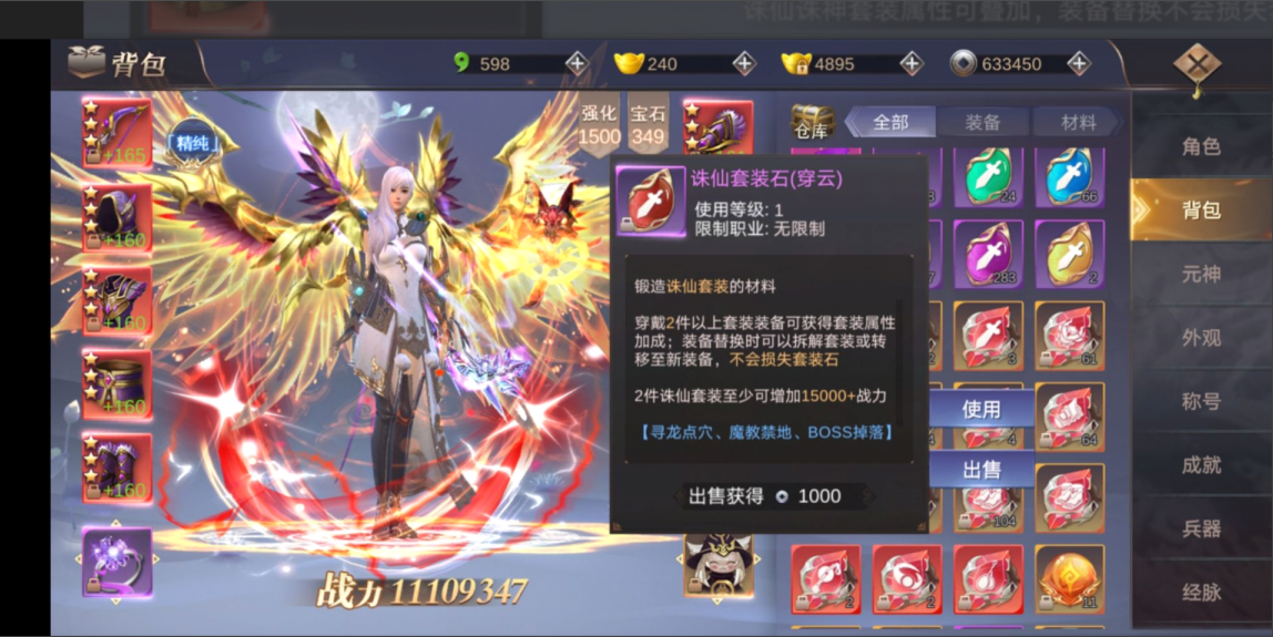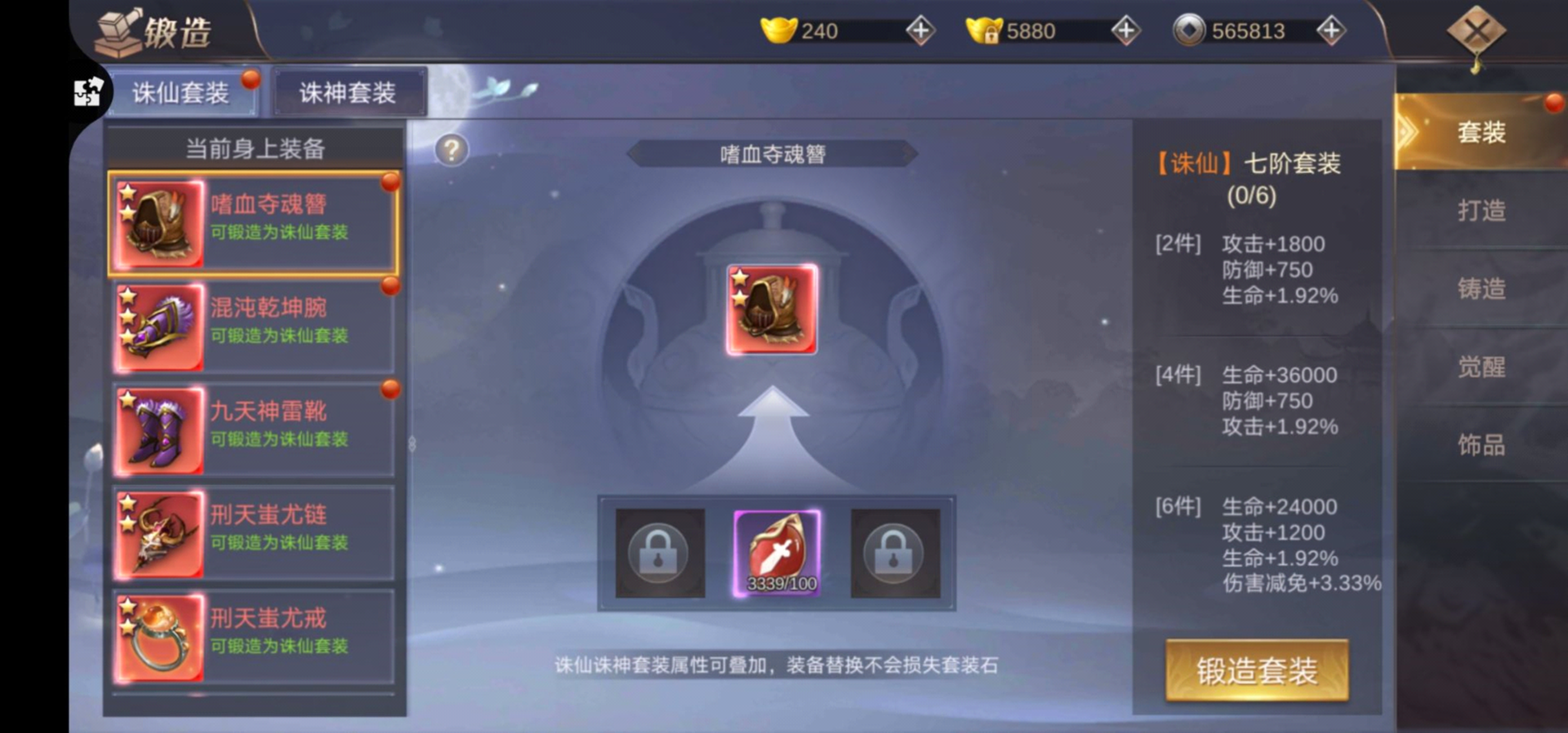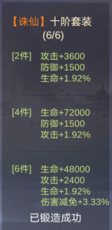 上方已附上,各阶装备,诛仙所需要的诛仙石,以及诛仙之后的套装效果。