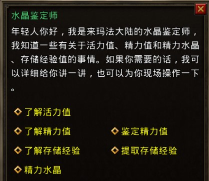 当玩家消耗完所有的活力值和精力值时,打怪只获得基础经验,并以储存的方式作为存储经验值。玩家可以消耗精力值来提取对应数量的存储经验。
