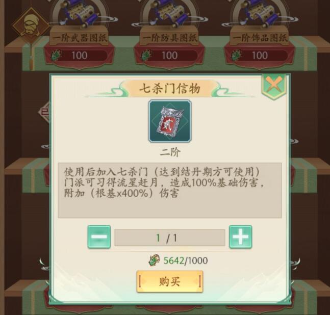 然后进入坊市的声望楼一层往下拉看看能不能找到一种叫七杀门令牌的信物,如图。