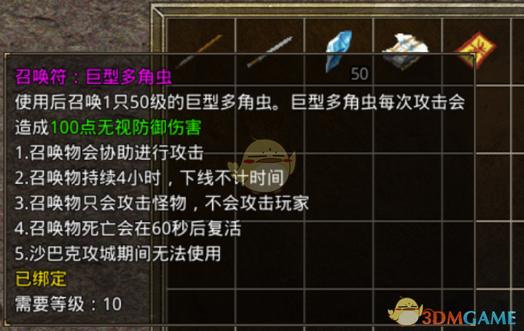 第一种,巨型多角虫,需要等级10级才能召唤,固定伤害为100点,可用300传奇币购买。