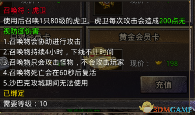 第二种,虎卫,需要等级10级才能召唤,固定伤害为200点,可用8元宝购买,白银会员每天可以通过领取工资的形式来获取一张虎卫召唤符,或者购买6元直购礼包获得。