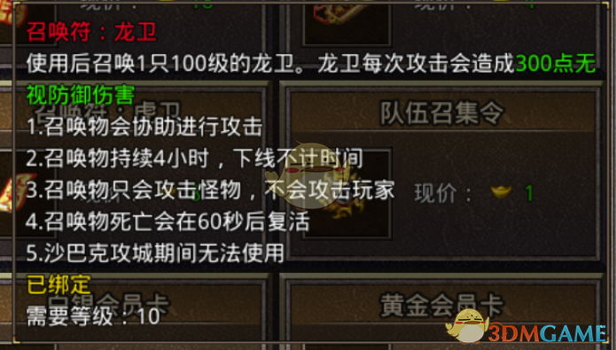 第三种,龙卫,需要等级10级才能召唤,固定伤害为300点,可用18元宝购买,黄金会员每天可以通过领取工资的形式来获取一张龙卫召唤符。