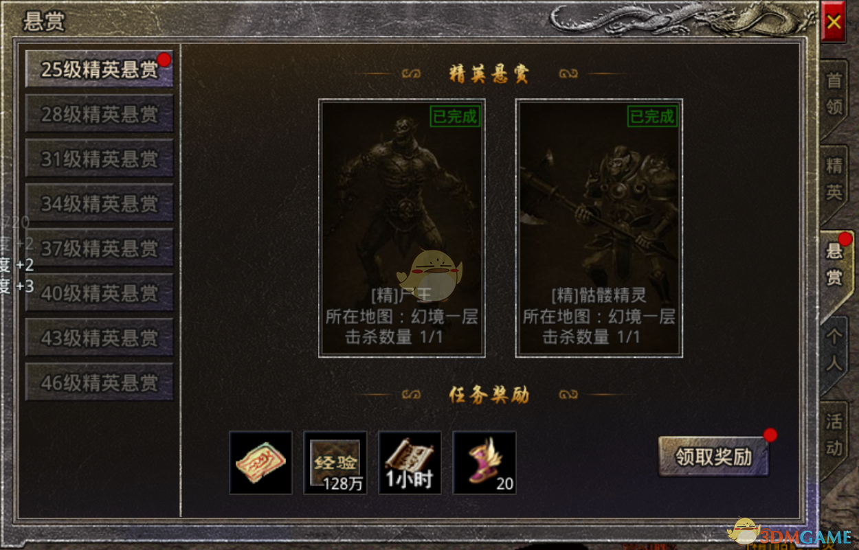 当玩家升到30级时,会开启精英悬赏任务,任务需要玩家击杀不同等级的精英怪才能完成任务,任务完成后可以获得大量经验和增加幻境的时间,需注意的是此任务不是每日任务,玩家只能完成一次。