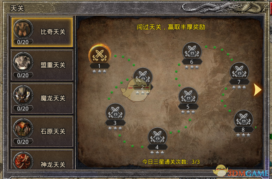 当玩家升到42级时,讲会开启勇闯天关任务,奖励为血魔精华,技能书页,金币等,随着关卡的提高,奖励也越来越丰富,只能三星通关才能开启下一关,并且每天只有三次三星过关的机会。