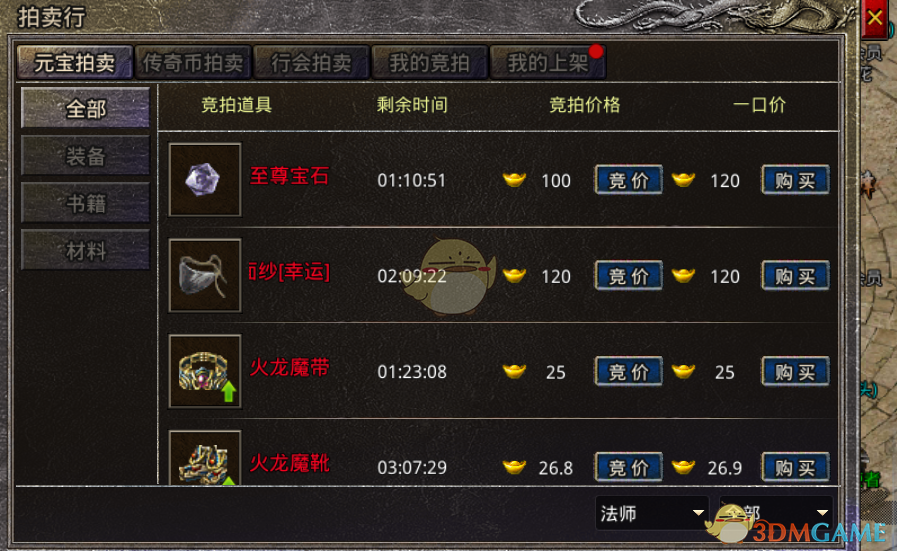 2、通关拍卖行购买装备,玩家可以用元宝和传奇币来购买自己喜欢的装备,同时也可以出售自己不需要的装备
