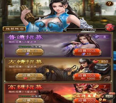 一定不要用元宝直接抽将,后面各种活动任务的招募令都只需要6折,直接抽比较亏