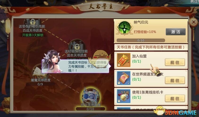 大家点击进入天书寻主之后,点击【归元天书进度】,可以在此页面右侧看到大家任务完成情况,没有完成的,可以点击【前往】完成。