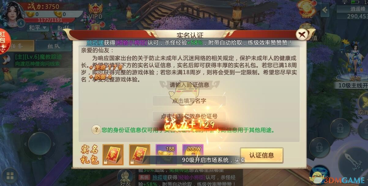 对于【注册登录】的玩家来说,如果没有实名认证,每次进入游戏会有提示,可以直接点击提示进入实名认证, 也可以进入游戏后,在人物角色头像右边的【实名认证】处点击进入!进入后页面如下: