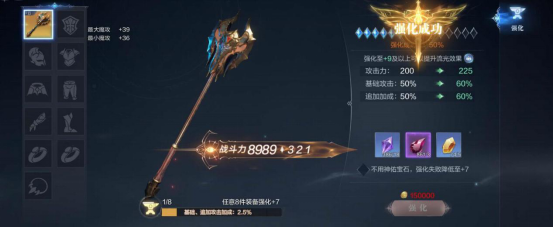 当然,装备的属性并非一成不变,你还可以通过强化、追加、镶嵌、进阶等方式来让你装备的属性得到进一步的提升。就比如说装备强化,你们可以使用祝福晶石来对装备直接进行强化,成功率是百分百,而当强化+7时,则需要一种灵魂晶石的物品进行强化,这时强化的话,可是有失败几率的,等到+9的时候则最好先积攒几块神佑宝石,这样即使失败也不会掉强化等级。