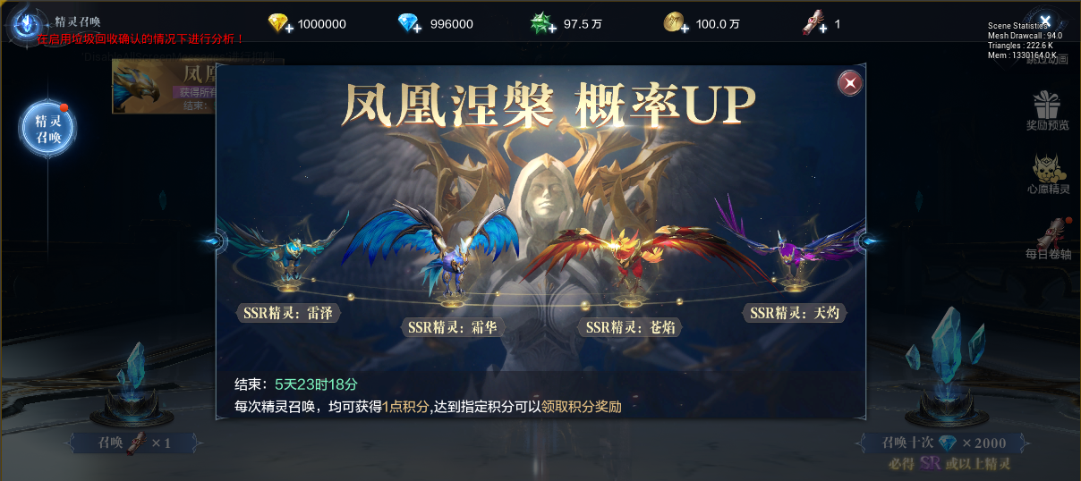 当服务器开启到一定的时刻时,游戏会同步开启精灵召唤活动。首期精灵召唤活动中,获得四只凤凰的概率均翻倍。