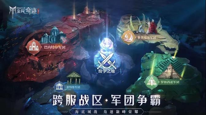 在跨服战区中,共有5个地图,四个来自不同区域的军团各自拥有1个领地地图,除此之外,还有1个名为纷争之地的公共区域地图。