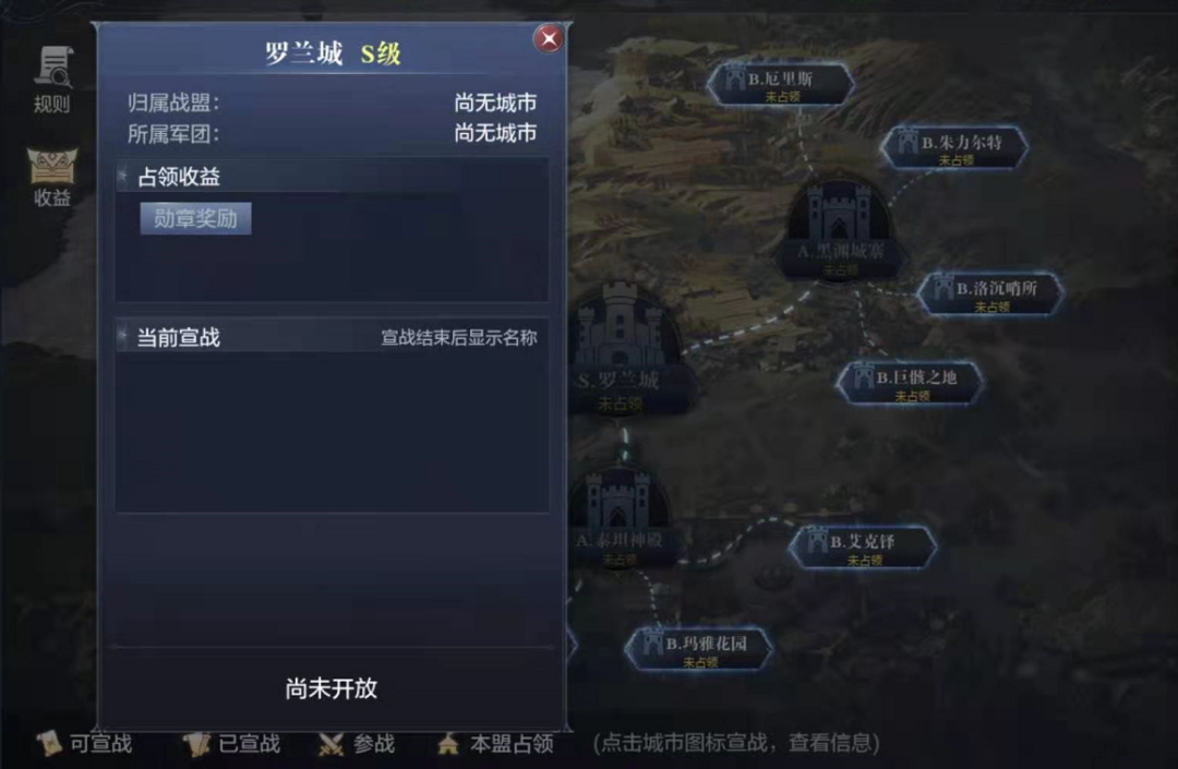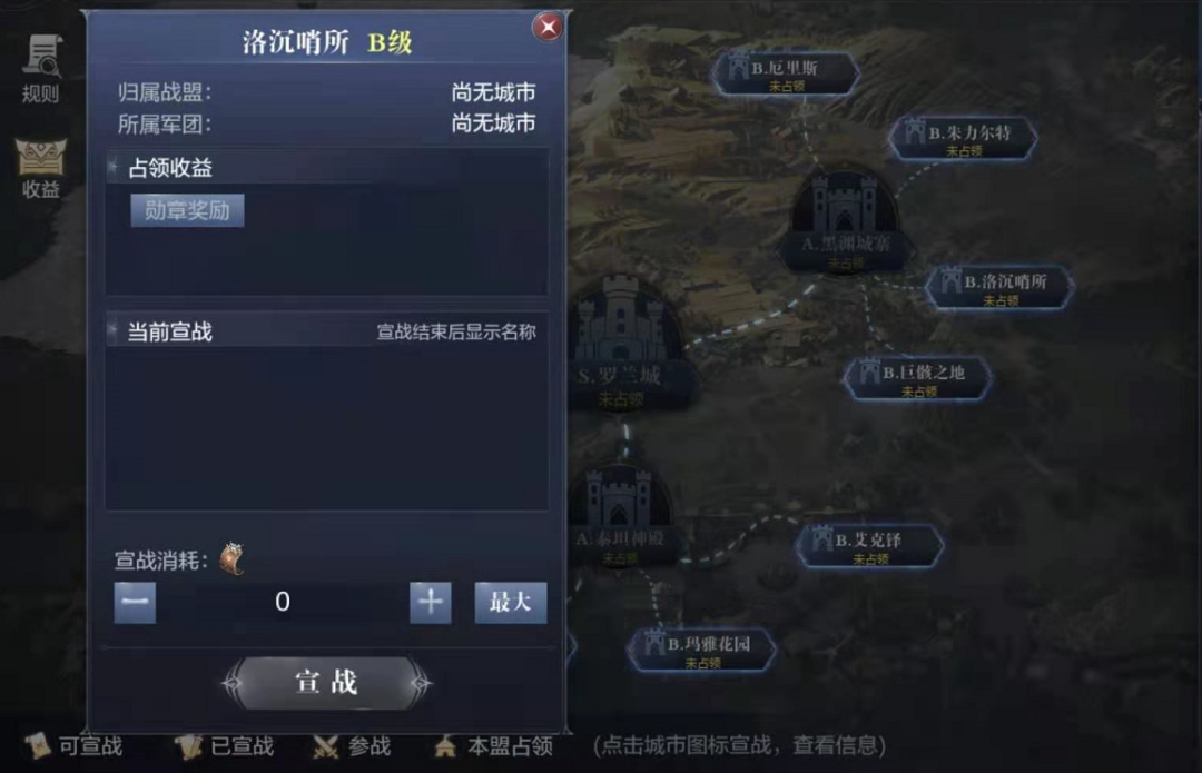 S级城市的难度自然更大一些,需要军团有战盟占领任意的A级城市时才可以进行宣战。所以相对较弱的战盟,最好选择守住一座B级城市就够了哦~