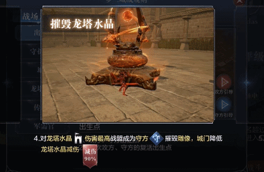 龙塔水晶最高减伤90%,但是摧毁城门和雕像后,可以降低龙塔水晶的减伤,当然,勇士们也可以选择变身为攻城车,攻城车可以对建筑造成大量的伤害。