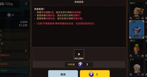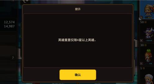 2、但是在使用英雄重置石的时候需要满足这名角色大于等于4星,使用之后会返还升级消耗的所有晶石,角色小于4星的话是不能使用英雄重置石的哦。