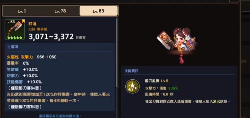 火刀的装备最佳选择就是专武「红莲」了,这个装备可以给火刀带来极大的强度提升。