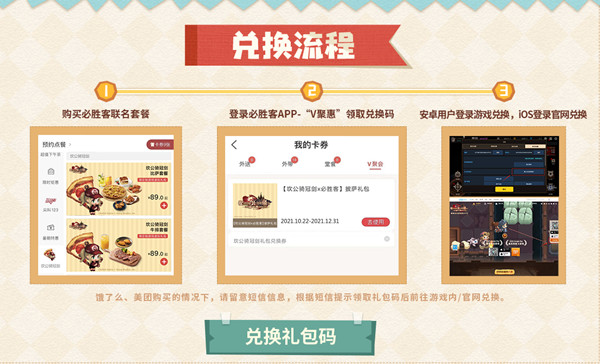 注意事项:每个游戏帐户仅可兑换1次【坎公骑冠剑X必胜客】披萨礼包,披萨外卖员骑士时装后续也将进入游戏时装商店,无法参与活动的守护者不必担心~ 通过指定线上购买方式购买,也可以获得礼包码哦!无法前往主题店的守护者也可以快乐外卖~~
