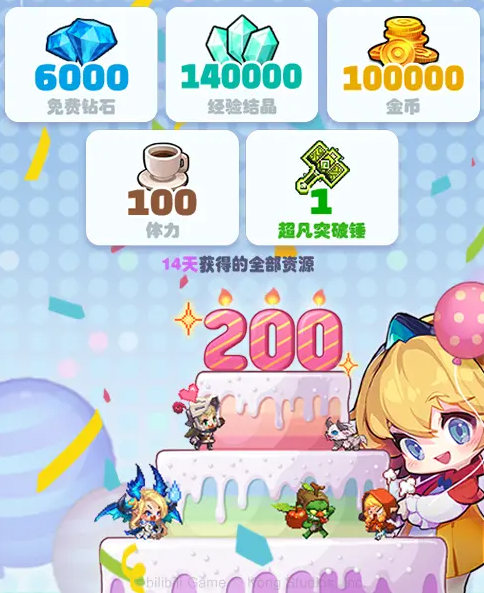 开启【200天纪念签到 免费礼包】后,活动时间内14天共计可领取【钻石*6000+超凡突破锤*1+体力*100+经验结晶*140000+金币*100000】奖励!