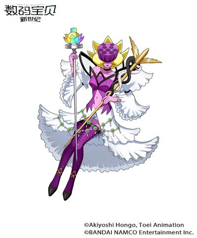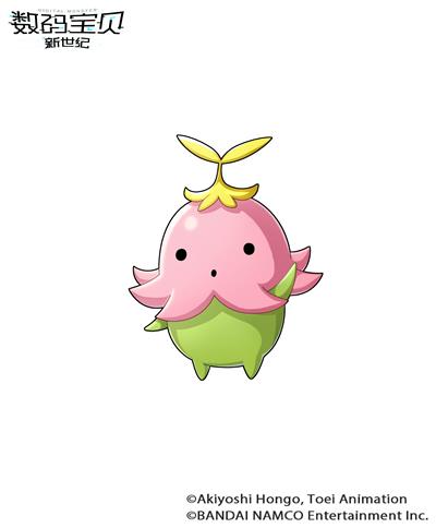 4、莲花兽:妖精型数码宝贝,奥义技是右手所持的彩虹色花杖散发出的七色灵气“七重幻想曲”将对方引诱到幸福的幻想世界,使其丧失斗志。