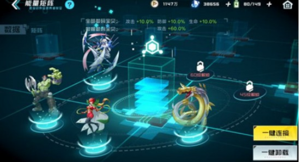 我们将完全体的数码宝贝放入能量矩阵里面,可以提供额外的数码宝贝属性加成,优先将队伍里面的数码宝贝放入能量矩阵中,可以得到更多的提高,解锁完全体越多,属性提高越多。
