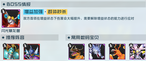 除了驱散、续航以外,就是拥有足够的单体突破能力。在这个关卡中,我们只要击败BOSS就能通过关卡。推荐大家可以选择狄安娜兽、战斗暴龙兽、蔷薇兽等单体爆发高的数码兽。