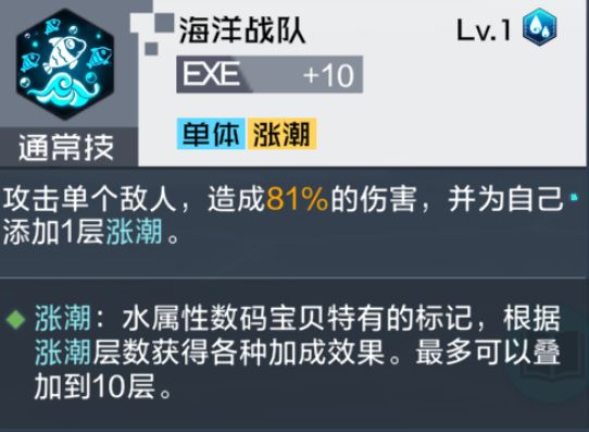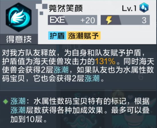 可为己方队友及自身赋予护盾,提升队伍成员坦度(可对残血数码兽赋予护盾,起到定向保护作用)。得意技可为自身及队友(如果为水属性数码兽)添加2层涨潮,对海天使兽来说可以更有效率的叠加涨潮,稳定发挥被动技效果(完全抵抗状态的赋予);如果与水属性数码兽搭配,可快速提升涨潮,使其更快发挥作用。