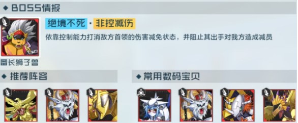 1. BOSS未处于控制状态时,会有99%的伤害减免。所以要使用拥有控制能力的数码兽,来让BOSS一直处于控制状态;