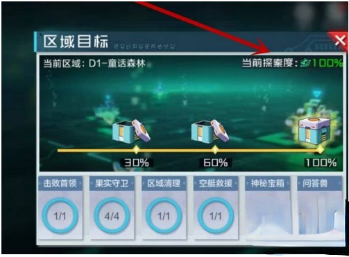 游戏中,“自动扫描”针对的对象是某一地图关卡,如下图,区域目标页面中,当前区域显示的是“D1-童话森林”关卡,这里就能使用自动扫描。