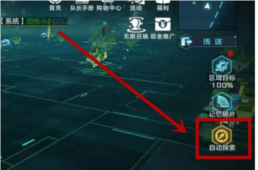 如下图,在“记忆碎片”项目的下面就是“自动探索”图标,注意图中的区域探索度已经达到了100%。