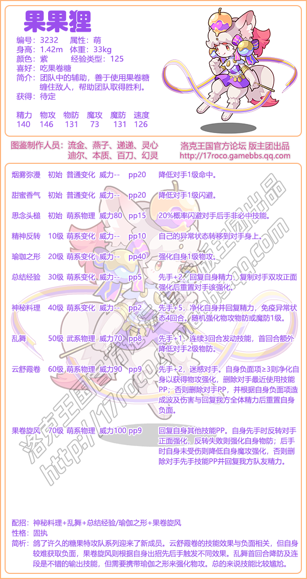 今日小编给大家带来了《洛克王国》果果狸技能表图鉴,这是一个编号3232的物攻宠物,同时也是糖果特攻队新成员,下面小编给大家分享一下【果果狸】技能表种族值帮助大家快速了解这个宠物各项信息,感兴趣的速来围观吧!