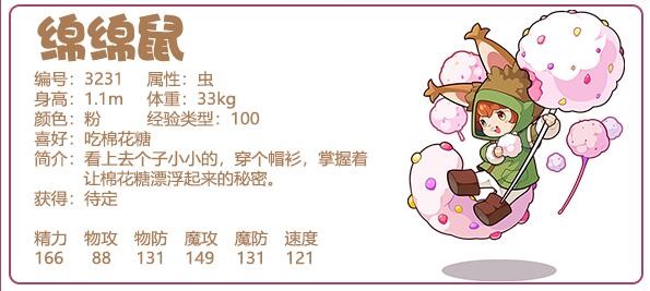 洛克王国绵綿鼠是糖果特攻队系列宠物之一,这是一个编号3231的虫属性魔攻宠物,看上去个子小小的,穿个帽衫,掌握着让棉花糖漂浮起来的秘密。接下来给大家带来了《洛克王国》绵綿鼠性格推荐:保守、胆小。冷静。