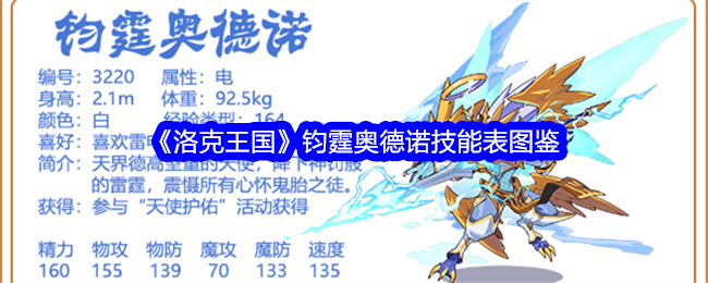 今日小编给大家带来了《洛克王国》钧霆奥德诺技能表图鉴,这是一个编号3220的物攻宠物,参与“天使护佑”活动获得!下面小编给大家分享一下技能表种族值帮助大家快速了解这个宠物各项信息,感兴趣的速来围观吧!