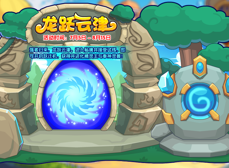 强者归来,龙跃云津。进入秘境并接受试炼,即可开启跃迁机,获得并进化精灵王与奉神灵兽!