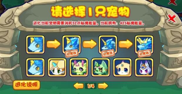 5. 对于需要进化的宠物,每个宠物的每个阶段各有且仅有1次进化机会,请玩家慎重选择需要进化的宠物。