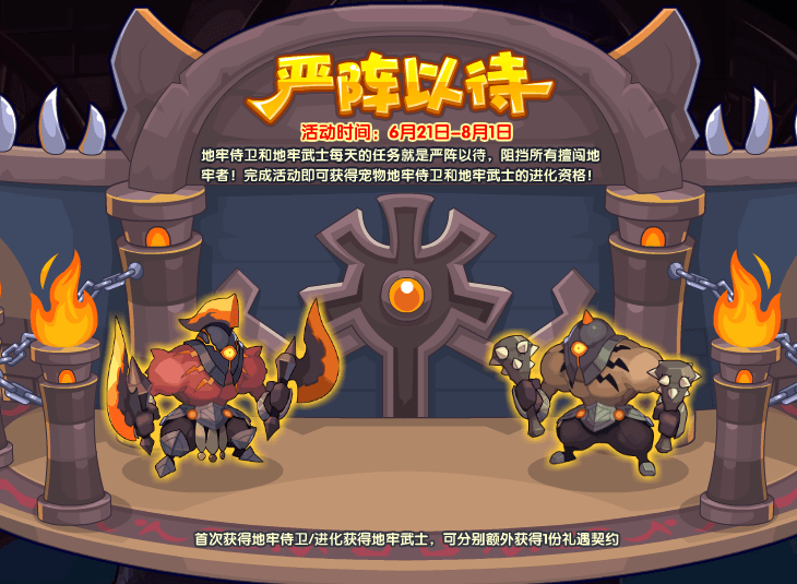4、地牢侍卫和地牢武士每天的任务就是严阵以待,阻挡所有擅闯地牢者!完成活动即可获得宠物地牢侍卫和地牢武士的进化资格!