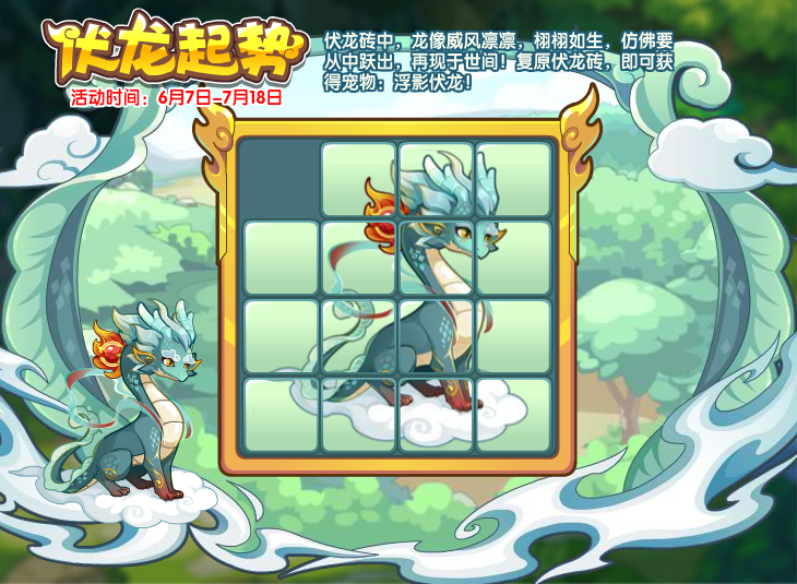 伏龙砖中,龙像威风凛凛,栩栩如生,仿佛要从中跃出,再现于世间!复原伏龙砖,即可获得宠物:浮影伏龙!