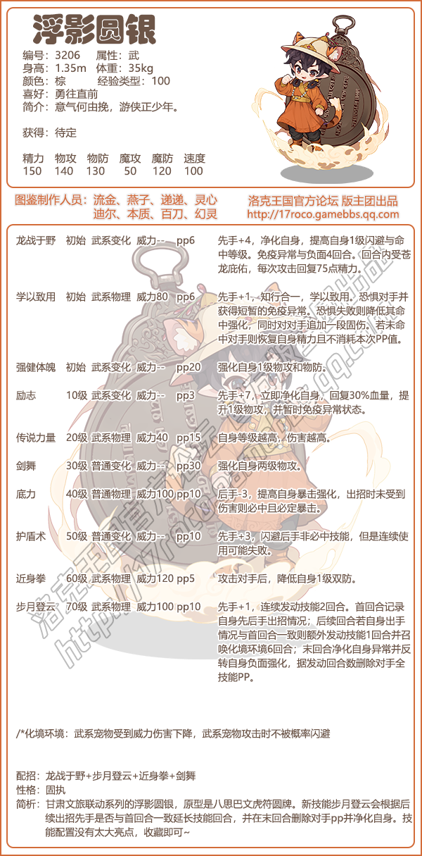 简析:甘肃文旅联动系列的浮影圆银,原型是八思巴文虎符圆牌。新技能步月登云会根据后续出招先手是否与首回合一致延长技能回合, 并在末回合删除对手pp并净化自身。技能配置没有太大亮点,收藏即可~