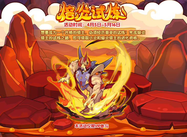 活动每天刷新两只BOSS,与之对战视作完成一次试炼。累计完成三次试炼可以领取:小炎;累计完成六次则开启:熔炎领主的超进化资格!