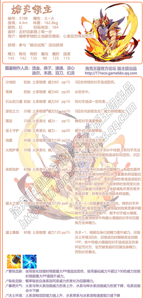 4、技能方面:余烬庇护提供较长回合的负面免疫并将余烬层数置为3层,自身根据余烬层数获得减伤与异常免疫;熔火之噬召唤暴晒天气并降低对手双防,对部分克制土系的系别有不小威胁,熔火痕标记提供一定的辅助能力,墟土爆裂则根据对手是否持有该印记附带不同效果;其他技能配置较差携带沙地狱即可。吸收血脉一定程度弥补了属性弱势,但概率触发比较看脸。蓄锐血脉则增强输出能力,可按需选择。大概在参赛系别合适的情况下有所发挥。