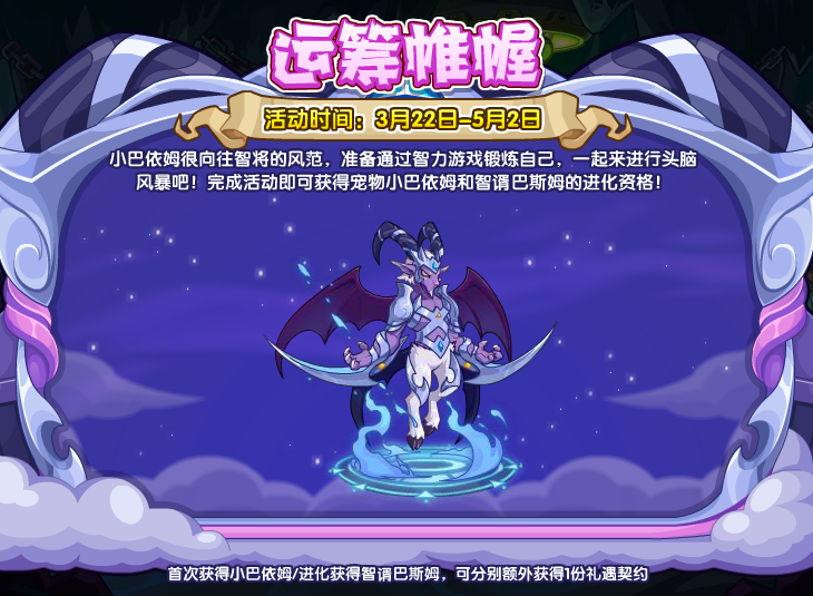 小巴依姆很向往智将的风范,准备通过智力游戏锻炼自己,一起来进行头脑风暴吧!完成活动即可获得宠物小巴依姆和智谞巴斯姆的进化资格!